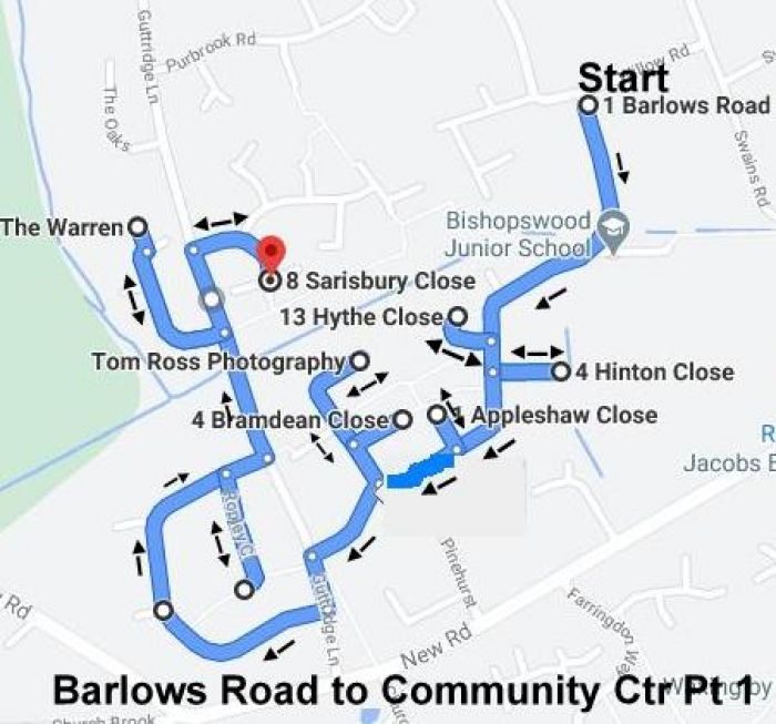 Part 1: Barlows Road, Hythe Close, Hinton Close, Burnley Close, Cheriton Close, Droxford Crescent, Ropley Close, Guttridge Lane, The Oaks, The Warren, Sarisbury Close and Offshoots, See below for Part 2.
